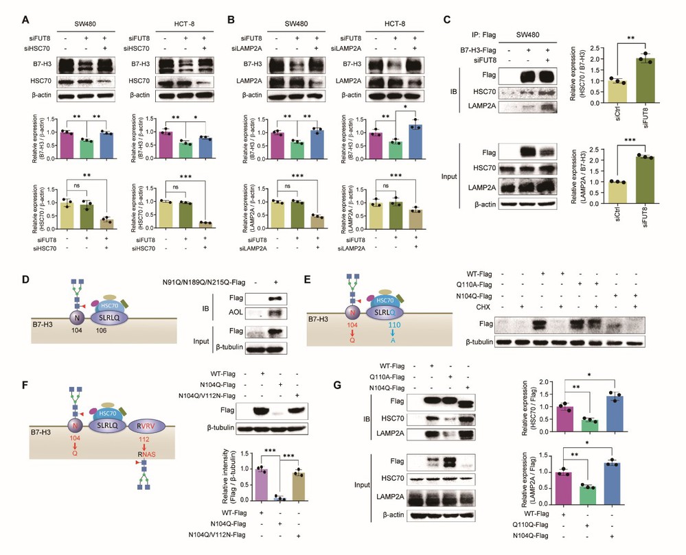 B7-H3 is an important immune checkpoint molecule in the same family as PD-L1. Enoblituzumab, a B7-H3-targeting antibody, showed potent clinical efficacy against prostate cancer in a Phase II clinical trial. The current study demonstrated that the core fucosylation at N104 on B7-H3 was mediated by FUT8. FUT8-silence-induced defucosylation at N104 on B7-H3 attracts heat shock protein family A member 8 (HSPA8, also known as HSC70) to bind with 106-110SLRLQ motif and consequently propels lysosomal proteolysis of B7-H3 through the chaperone-mediated autophagy pathway.