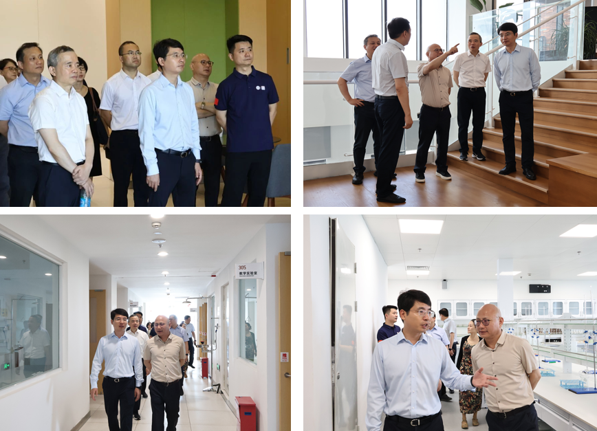 On the morning of July 19th, President Zhang Qiao visited the Future Campus for research and guidance. He inspected the teaching and research laboratories of the International College of Pharmaceutical Innovation, listened to the latest progress and future plans of the school in discipline layout, faculty recruitment and development, talent cultivation, and international cooperation. Vice President Shen Mingrong and Zhang Zhengbiao, accompanied the research, while heads of relevant functional departments participated in the research and symposium.