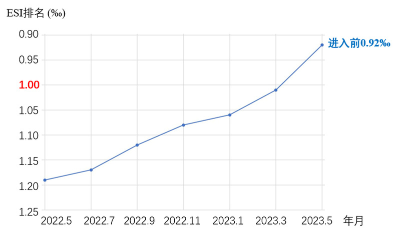 基本科学指标数据库(Essential Science Indicators,简称ESI)作为衡量科学研究绩效、跟踪科学发展趋势的权威分析评价工具,已在国际范围内广泛应用于评估学术机构和大学的科研水平及影响力。ESI排名的高低很大程度上反映了学科的国际竞争力和声誉。