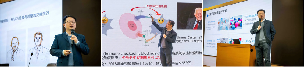 刘老师通过其团队丰富的科研成果,向同学们展示了跨学科研究的独特优势,他详细阐述了当前被认为最有可能突破肿瘤治疗瓶颈的肿瘤免疫治疗技术的原理以及各种技术路径的最新进展。例如,尽管CAR-T免疫细胞疗法的成本昂贵,但其治疗成功率较高;而免疫检查点阻断(ICB)抗体疗法作为主流的临床疗法,有大量厂商参与“内卷”,价格相对低廉,但由于其非特异性的特点,故而治疗的应答率并不理想:肿瘤个性化疫苗则因操作繁琐、价格极其高昂而几乎无法推广。因此,刘老师向同学们展示了其团队对这一难题的解决思路。他们借助纳米材料构筑微环境调控栓塞微球,将癌细胞周围缺氧、偏酸的微环境改变为有氧、偏碱的环境,同时与免疫检查点阻断(ICB)抗体疗法相配合,帮助免疫细胞清除癌细胞。这一方法取得了明显的进展,深刻体现了学科交融的优势所在。