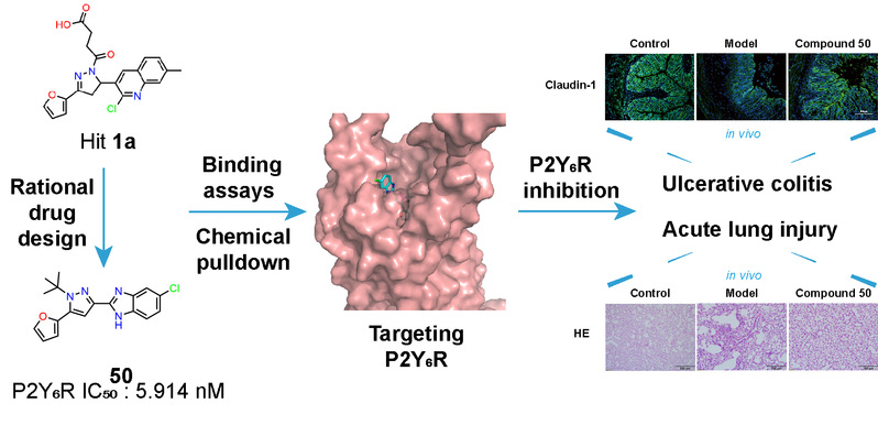 近年来,苏州大学药学院李环球课题组围绕靶向嘌呤受体P2Y6R和P2Y14R小分子药物开发方面开展了一系列研究(J Adv Res 2020, 23, 133-142; Drug Discov Today. 2020, 25, 568-573; Front Immunol 2022, 13, 870183; Eur J Med Chem 2022, 227, 113933; Phytomedicine 2023,115, 154851.)。在上述研究基础上,该团队与药学院田盛副教授、中国药科大学胡庆华教授团队合作,在药物化学领域顶级期刊Journal of Medicinal Chemistry上在线发表了题为“Discovery of Selective P2Y6R Antagonists with High Affinity and In Vivo Efficacy for Inflammatory Disease Therapy”的研究论文。苏州大学药学院为本论文第一完成单位,药学院硕士研究生朱一凡和中国药科大学周梦泽为共同第一作者,苏州大学药学院李环球副教授、田盛副教授和中国药科大学胡庆华教授为共同通讯作者。